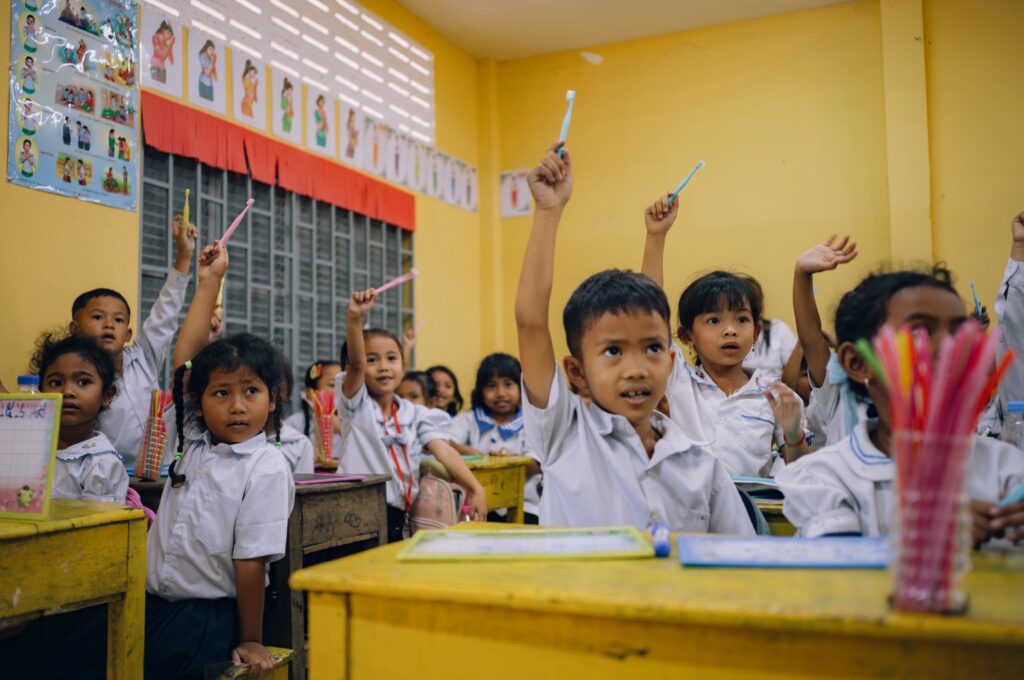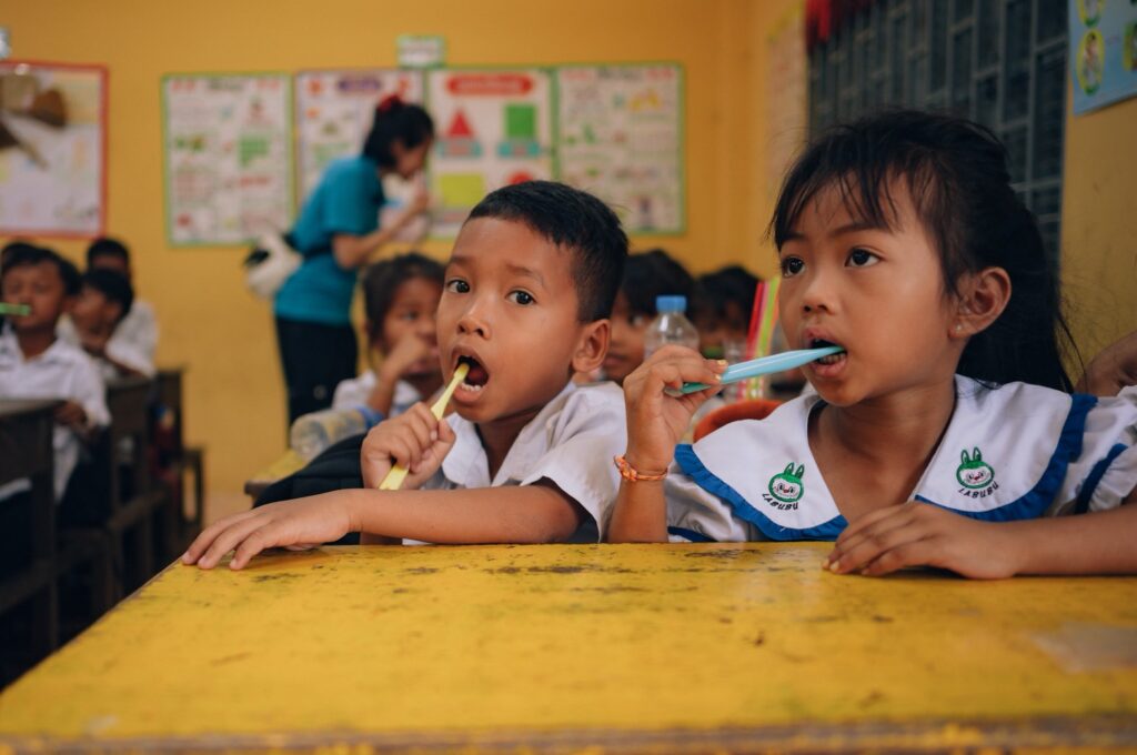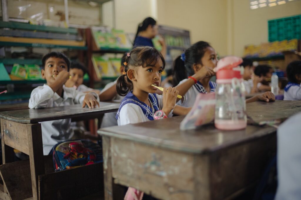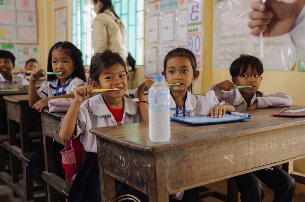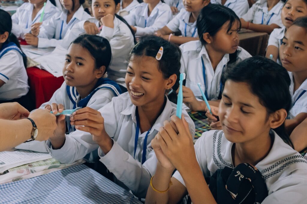 株式会社オーラルケア様よりご提供いただいた1000本超の子ども用歯ブラシを、カンボジア現地の小学校2校へと確かにお届けしました。